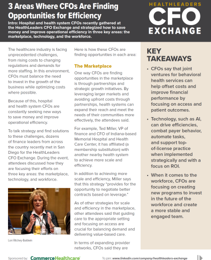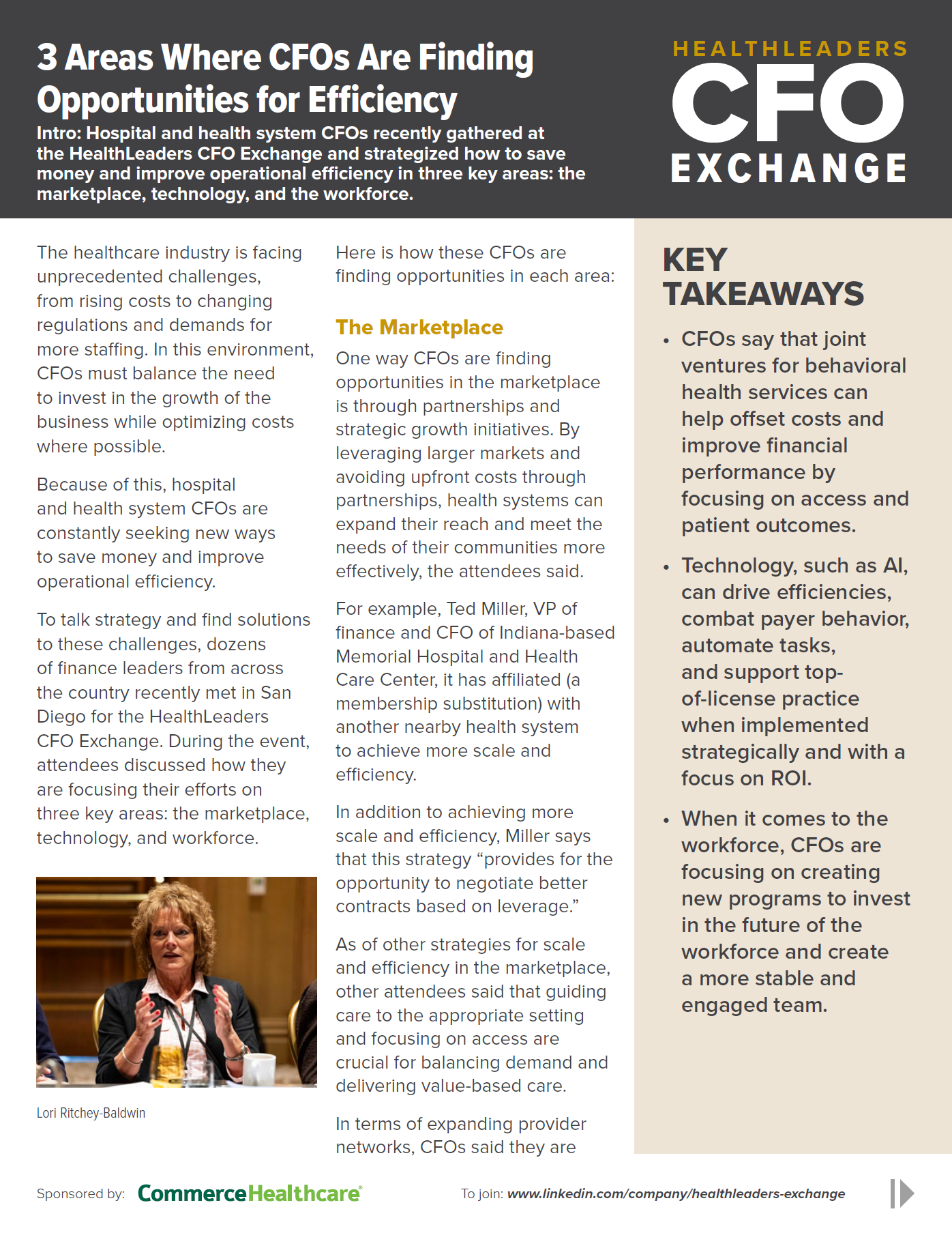 To talk strategy and find solutions to these challenges, dozens of finance leaders from across the country recently met in San Diego for the HealthLeaders CFO Exchange. During the event, attendees discussed how they are focusing their efforts on three key areas: the marketplace, technology, and workforce.