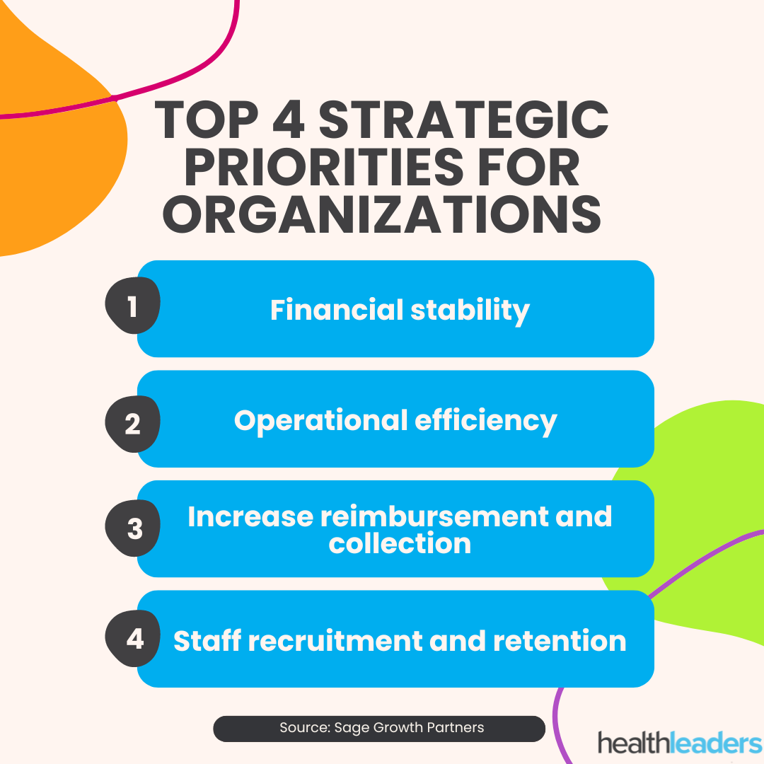 As leaders adapt their strategies to fit the changing healthcare economy, certain pain points are prioritized over others. Surveying 115 executives within revenue cycle, finance, IT, and operations, a recent Sage Growth Partners report found that executives are prioritizing the following for their organizations: