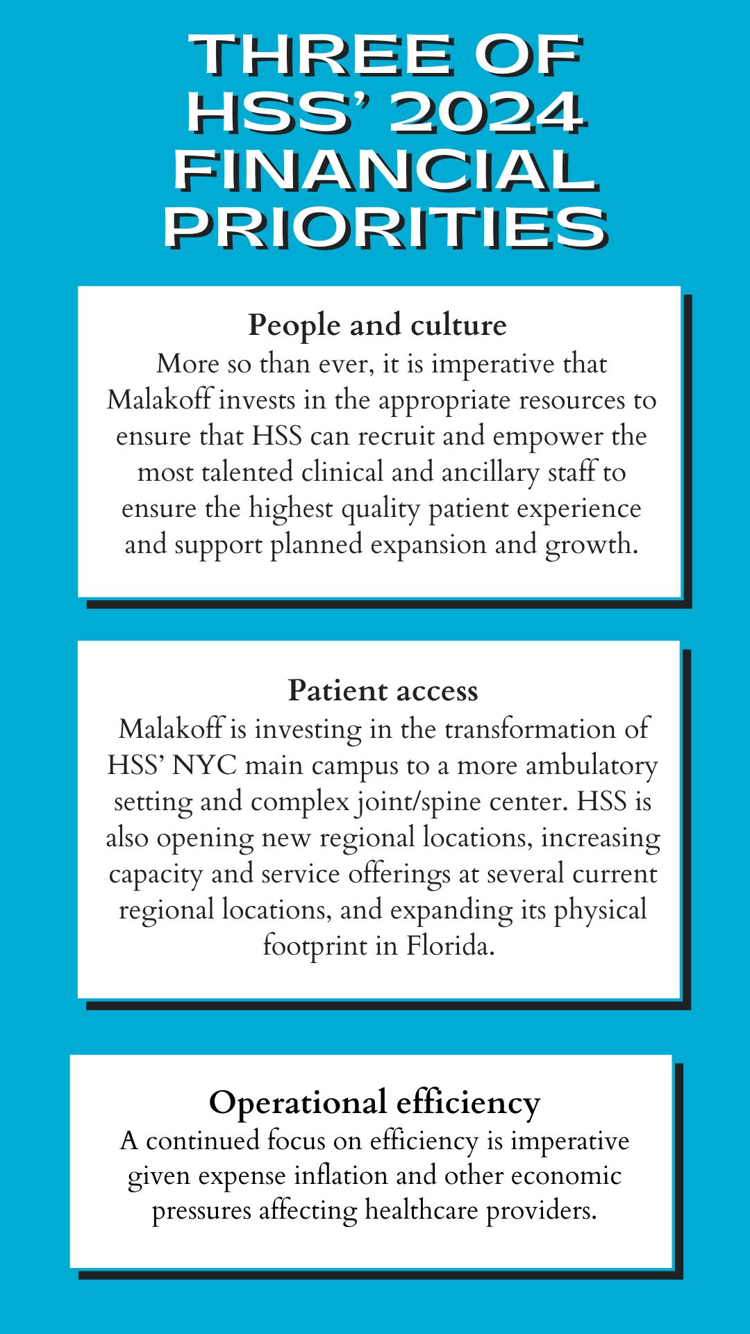 For example, Stacey Malakoff, the CFO of New York-based Hospital for Special Surgery (HSS), told HealthLeaders that more so than ever, it was imperative that HSS invested the appropriate resources to ensure the highest quality patient experience and to support planned expansion and growth in 2024.