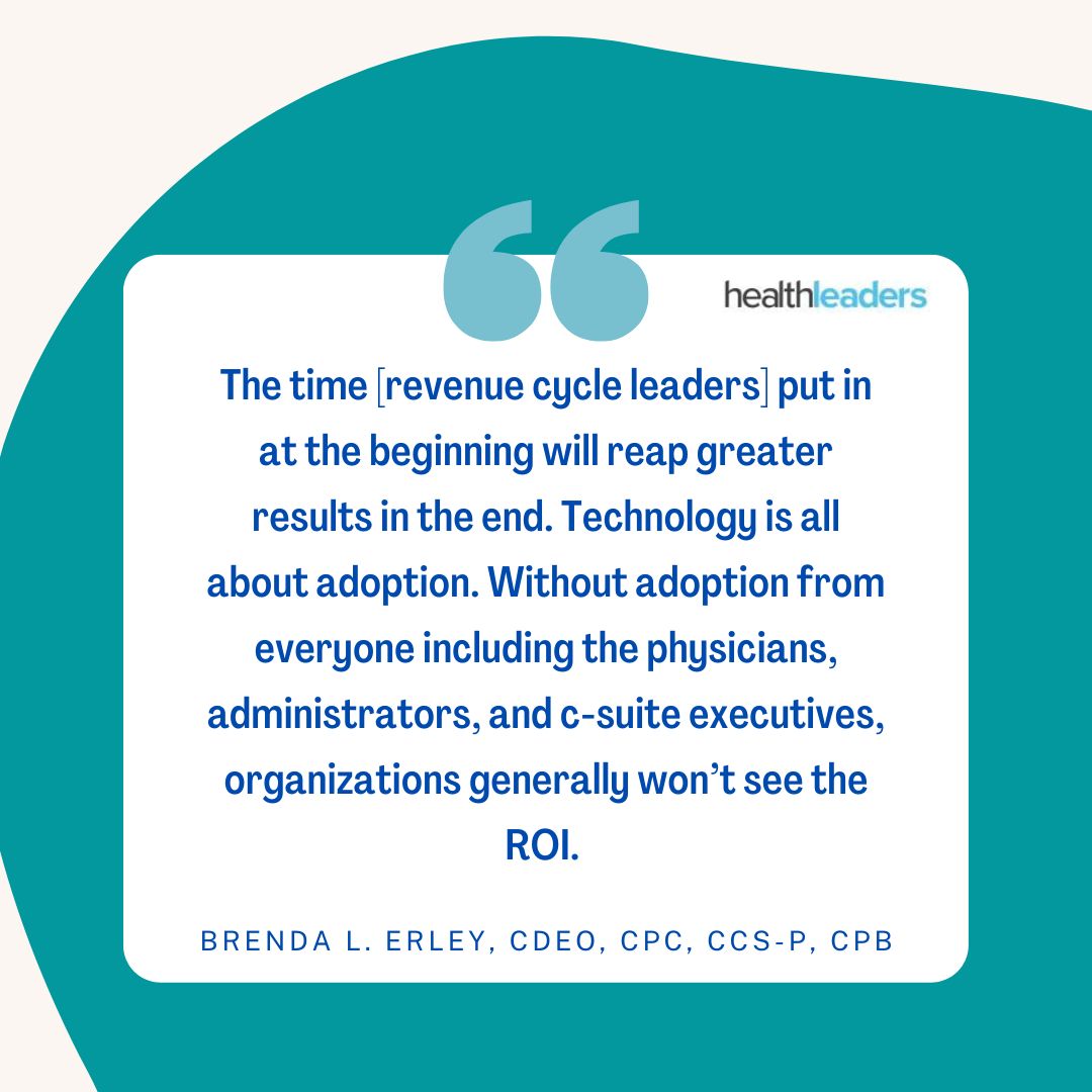 To shed some light, Brenda L. Erley, CDEO, CPC, CCS-P, CPB, director of front and middle revenue cycle management services, at Strivant Health, recently spoke to Healthleaders on how revenue cycle leaders can better streamline technology, alleviate staffing issues, gain administrative buy-in, and see a ROI.