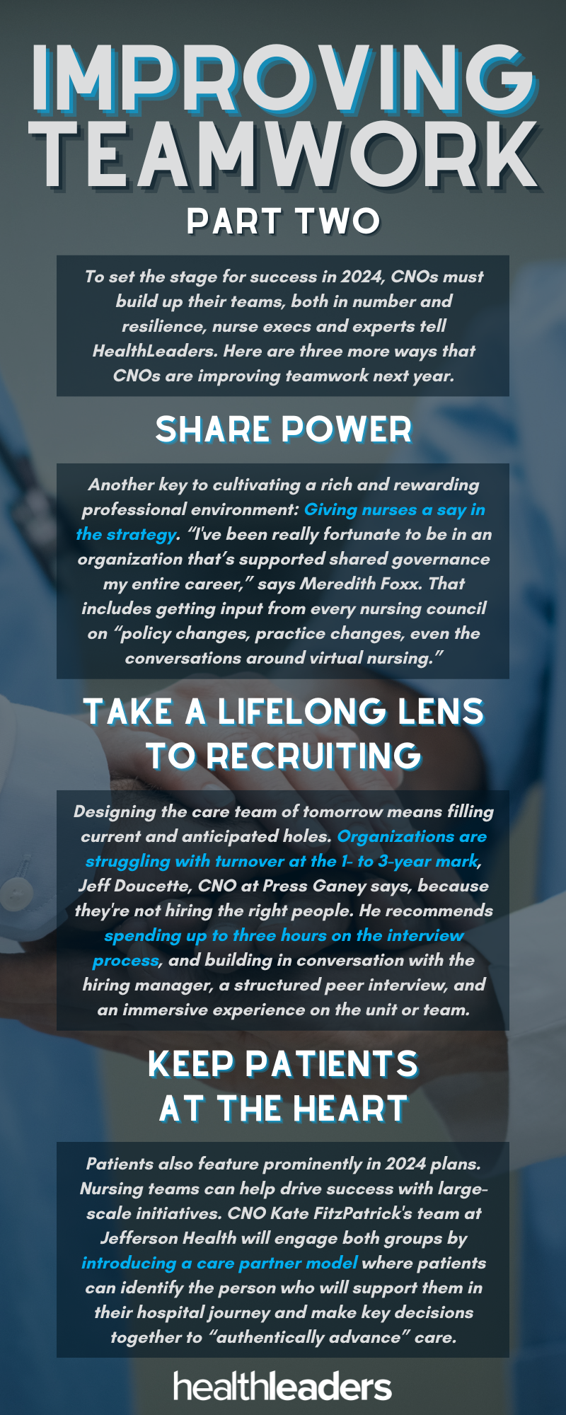 To set the stage for success in 2024 and beyond, CNOs must build up their teams, both in number and resilience, nurse execs and experts tell HealthLeaders. That means making compensation compelling, fostering shared purpose, redesigning care models, and playing a very long game when it comes to recruiting.