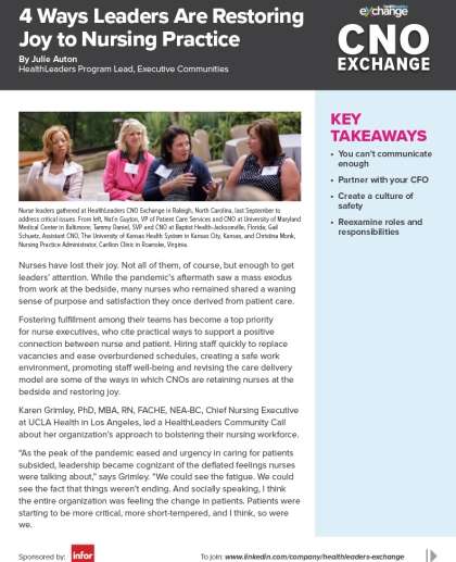 Fostering fulfillment among their teams has become a top priority for nurse executives, who cite practical ways to support a positive connection between nurse and patient. In this exclusive report, hear from nurse leaders about how they are restoring the joy to nursing.