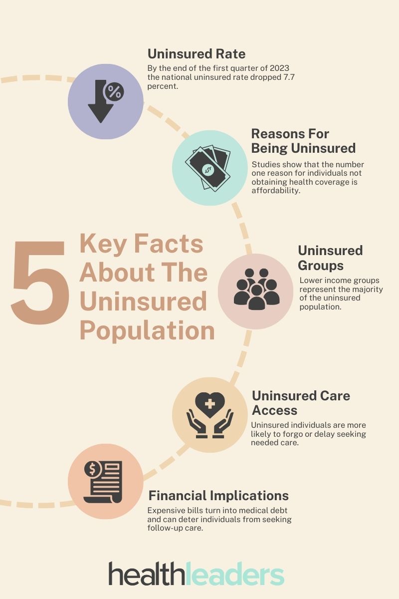 Not being able to secure health coverage can have massive financial implications. When individuals without insurance do seek care, they're often faced with expensive bills that they cannot afford. Since most of the insured population is a lower-income group, seeking care can quickly turn into medical debt affecting other financial aspects of the individual's life and possibly deter them from seeking follow-up care.