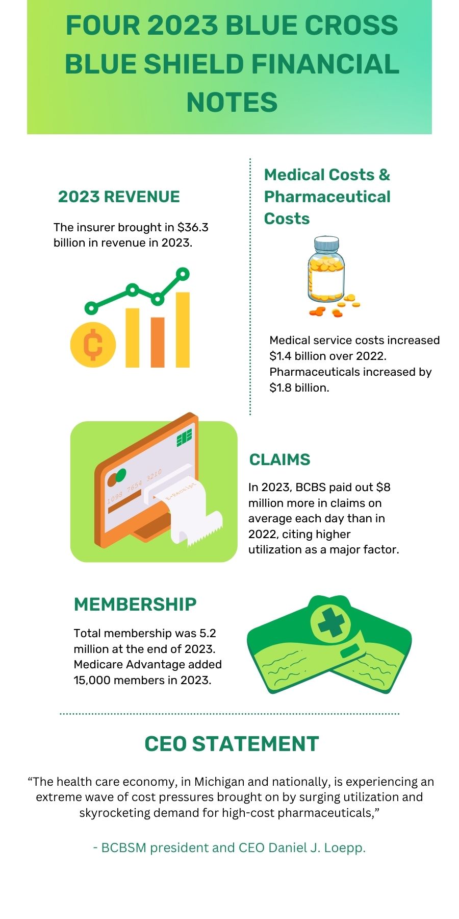 In the news release BCBSM CEO stated: “The health care economy, in Michigan and nationally, is experiencing an extreme wave of cost pressures brought on by surging utilization and skyrocketing demand for high-cost pharmaceuticals,” said BCBSM president and CEO Daniel J. Loepp. “Despite these extraordinary pressures, Blue Cross retained our membership, managed a positive financial margin, and continued our dedicated efforts to promote affordable health coverage for our members in 2023.”