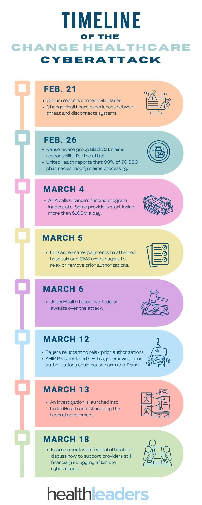 Feb. 21: Optum reports “enterprise-wide connectivity” issues and later says Change Healthcare was experiencing a network disruption caused by a cybersecurity threat. Change’s system was disconnected.